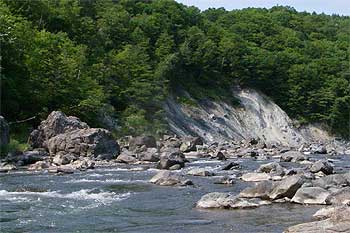 その瀬は2段になって落ちていて、右岸寄りがヒーローコース。左岸に寄れば1段目の落ち込みを避けることができる。二人の沈さえ無ければ、当然の様にヒーローコースを下るつもりだったけれど、まずは1段目を左にかわす。2段目の落ち込みももっと左に寄ろうとしたけれど、流れに引き寄せられ落差の大きい場所に入ってしまう。