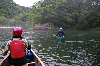 | 手始めの瀬で痛そうな沈をしたkenjiさんペア | 曇り空の下の集いのプール、正面にきらer岩 |