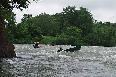 結局ゴルジュ出口の瀬では、Y谷さんとF本さんのカヤックがホールに引きずり込まれて沈脱、そしてカヤック1艇流出、kenjiさんのカナディアンは水沈、S吉さんのカナディアンがガンネル破損と散々な結果となったのである。