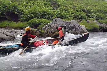 雲の切れ間から青空も見えるまずまずの天気。 何時もはすんなりと下れていたのに、今回はその岩壁の手前でカヌーの底を思いっきり岩にぶつけてしまった。 常に同じ状況だとは限らない自然の川。 |