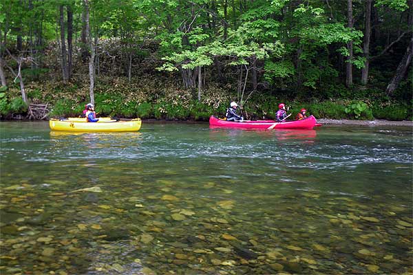 先に下っていったノームのメンバーを追いかけて、私達も再び下り始める。 水量は多くもなく少なくもなく、邪魔な岩が隠れてくれて、ちょうど下りやすい状態である。 その後は、緑に包まれた空知川をのんびりと下ってゴールの山畔橋を目指す。 空知川は何度下っても楽しい川である。 |