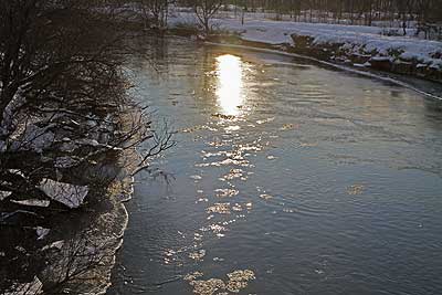 おまけに、岸から2mほど先まで川面には厚い氷が張っていた。昨日下見した時はそんな氷は張っていなくて「これならば出艇も問題なし」と判断していたのだ。 しょうがないので、そのまま氷の上にカヌーを下ろして二人で乗り込む。それくらいでは厚い氷はびくともしない。 「すげ〜っ!」 |