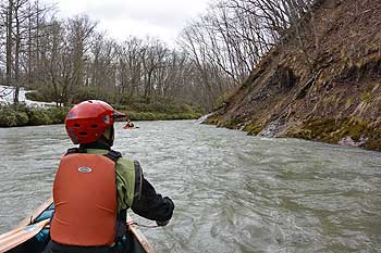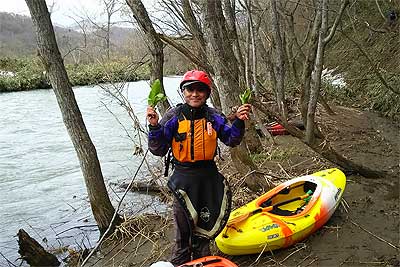その瀬を過ぎた後は、うねりはあるものの、白波の立つような瀬は現れず、増水して流れの速くなった厚田川を淡々と下っていく。 木々の芽はまだ固いままで、目に付く緑はとうが立ち始めたフキノトウくらい。 |