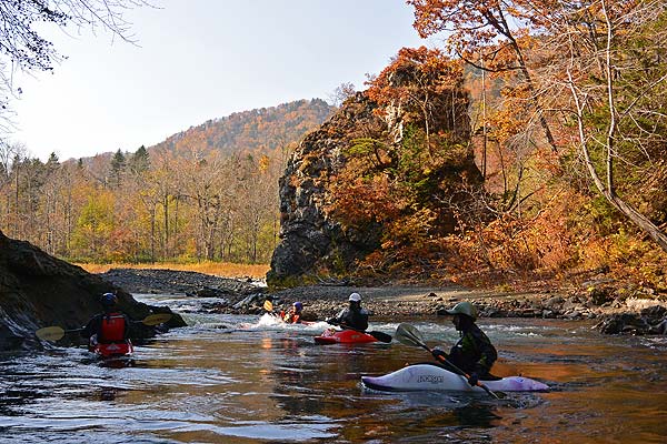 川そのものも、ゴツゴツした岩場は少なく、玉石の川底に所々岩が絡む感じである。 この区間をカヌーで下った情報は全く無く、流れの先で何が待ち受けているかは、誰にも分からない。 |