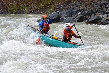 | 瀬を下る熊五郎さんご夫妻 | 波に突っ込む |
