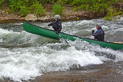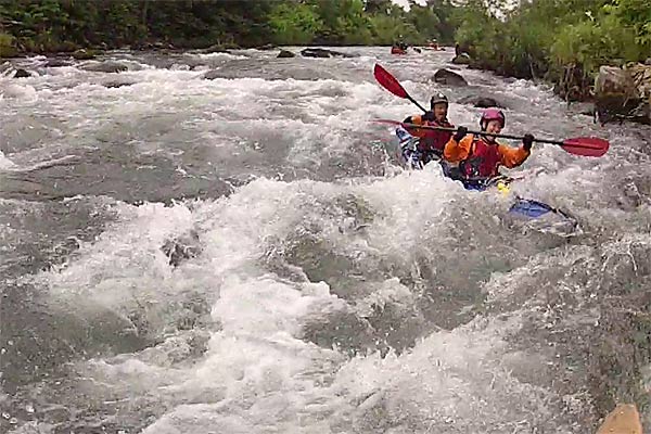 私達と同じくここを下るのが今シーズン3回目となるH池・M木ペアは、ベテランの風格さえ漂わせながら、バウを思いっきり跳ね上げて瀬を乗り越えていった。