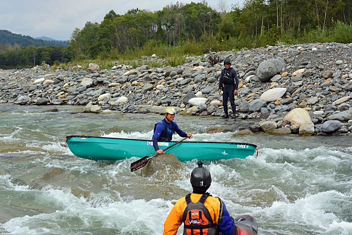 今日の水量ではそれ程大きな波も立たず、皆無事に瀬を下り終えた。