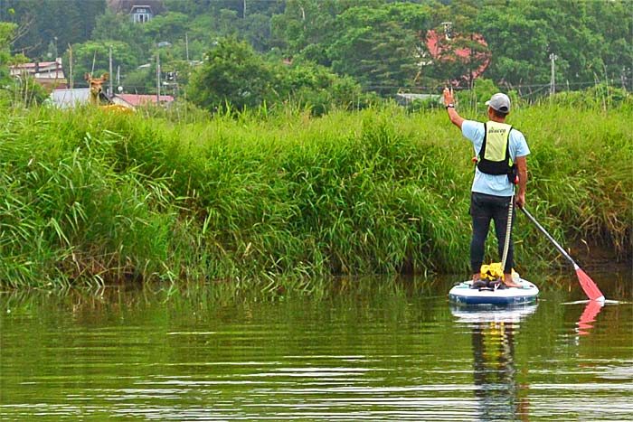 そんな浮草をかき分けて沖に出ると、佐々木さんがSUPを力強く漕ぎ始めた。