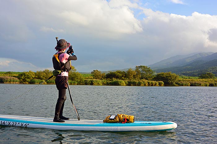 Nもとさんは今回、新艇のSUPに乗っていた。
