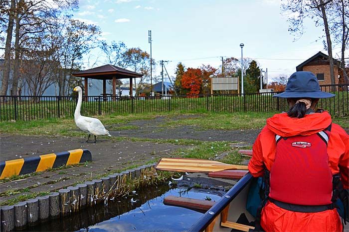 カヌーポートにはオオハクチョウが一羽居座っていて、人が近づいても全く逃げようともしない。