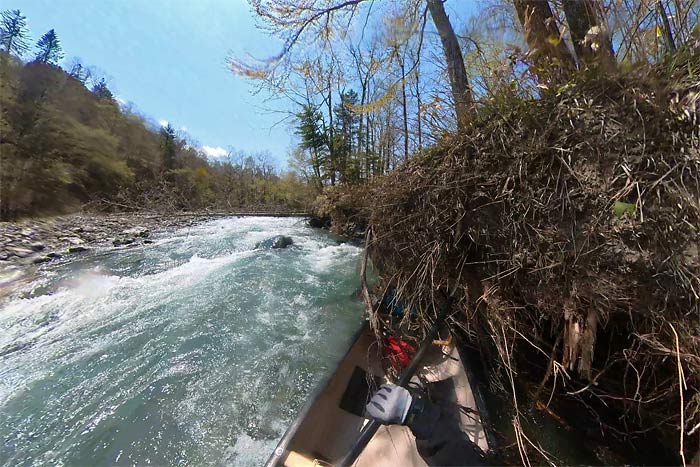 そんな風景を楽しみながら、調子に乗って先頭で下っていると、少し激しい流れの瀬に入ってしまった。