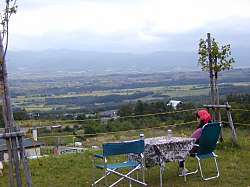 | 先週のキャンプは雨で中止、今週末の天気はまたしても雨の予報だ。 土曜日が曇りのち雨、日曜日は雨で午後からやむ、雨量も多くなる地方あり、最悪である。 それに、今回予定しているキャンプ場はサイトからの展望が売り物の岩内マリンビュー、ここで雨が降ってせっかくの展望が楽しめなければ、わざわざそこを選んだ意味が無くなってしまう。 それでも、無理に出かけることにしたのは、このままでは9月に一度もキャンプへ行けなかったという去年の二の舞になってしまうからだ。 それにもう一つ、最近は雨の予報を聞いただけですぐにキャンプを中止にするという軟弱キャンパーになり果てていたので、そろそろ自然の厳しい洗礼を浴びるようなキャンプをして、自分の目を覚まさせよう、という気持ちもあった。 キャンプの楽しみの一つに非日常体験というものがあると思う。 確かに、爽やかな青空の下、森の香りや鳥たちのさえずり等に身を任せるのも楽しいキャンプだ。 でもそれ以外に、普段の生活では味わえないような体験が出来るのもキャンプの魅力の一つである。 最近になってはじめた雪中キャンプなどはまさに非日常の世界だ。 雨の中のキャンプは、そんな非日常の世界を手軽に味わえる絶好の機会なのである。 とは言いつつ、どんよりとした曇り空の下でキャンプの用意をしていても、少しも高揚した気分になってこない。 翌日の、びしょ濡れのテントやタープの撤収のことまで考えると、ますます気分はブルーである。 それでも、到着した岩内の空は曇り空ながらも視界はまずまず、これならばマリンビューご自慢の展望も楽しめそうだ。 キャンプ場の受付では一番眺めの良いサイトを選んでもらった。このキャンプ場は山の傾斜地に作られているので、当然高い場所のサイトの方が眺めが良くなる。さすがにそのような場所は、すでにほとんど埋まってしまっていた。 どこにするか迷っていると、受付の方が我が家が夫婦二人だけなのに気が付いて、トイレや炊事場からは離れているが一番奥まった場所にあるサイトを、静かに過ごせて良いかも知れませんよ、と勧めてくれた。 嬉しい配慮である。いくら眺めが良くても、両隣をテントに挟まれてしまうとどうも落ち着かない。一も二もなく、すぐにそのサイトに決定した。。 ゲートをくぐり、道路を一番高い場所のサイトまで登っていくと、そこは先ほど到着したばかりといった様子のキャンパーが既にびっしりで、一生懸命テントの設営中である。 みんな、今日の天気予報が雨なのを知っているのだろうか。こんな天気ならば、キャンパーもほとんどいないだろうという我が家の予報は、見事に外れてしまったのだ。 それでも、受付の方が勧めてくれたサイトは、そんな混雑した場所からはちょっとだけ離れており、眺めも良くて本当に良い場所だった。 早速、設営に取りかかるが、雨と風に備えて張り綱をいつもより多めに張った。持参したペグを全て使い切ってしまい、準備の不足にちょっとだけ反省する。設営が終わるとお決まりのビールタイム、下界の景色を眺めながらのビールはなかなか気持ちが良い。 でも、この時期になるとテントの設営で汗をかくこともなく、ちょっとだけ肌寒いビールの味である。 心配していた雨もなかなか降ってこない。 これだけ設営も完全にして、心構えも出来ているというのに、次第に雨の降るのが待ち遠しくさえなってきた。 夕食の準備を始めた頃に、ようやく念願の雨が落ちてきた。 ところがその雨と同時に、次第に風も強まってきてしまった。雨だけならば、どんなに土砂降りになっても平気だが、風と雨が一緒になると、これはちょっとやっかいである。 せっかく、テントの上にタープまで張って完全装備の状態なのに、横から吹き付ける風でタープがその役目を果たしてくれない。 それでも、我が家のテントには広めの前室が備わっているおかげで、そんな状態でも何とか快適に過ごすことができる。 場内放送では、今夜は突風が吹く恐れがあるので、タープを張っている人は無理をせずに撤収するか、ペグを深く打ち込むようにとの注意が流れている。 その後、管理人さんが回ってきて、各キャンパーに注意を促していった。 眺めが良い場所はそれだけ風当たりも強くなってしまう。 風向きからいって、我が家のテントが一番その影響を受けそうな場所であったが、完全な準備をしていたのでそれほど心配にはならない。 夕食を食べる頃になると、風も雨もピタリとやんでくれた。眼下には美しい岩内の夜景が広がり、場内で行われるマリンビュー市で仕入れたホタテを焼きながらワインに舌鼓、期待はずれの穏やかな夜である。 ところが、しばらくすると裏手の山の方からゴーッという音が聞こえてきた。 するとまもなく、強烈な風が吹き付けてきて、同時に場内のあちこちでタープが飛ばされたみたいだ。 強風に歪められるテントの中、キャンプはこれでなくっちゃと