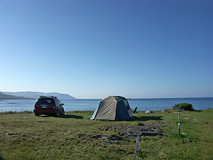 真っ青なオホーツク海を、来るときとは反対側に眺めながらの気持ちの良いドライブ。同じ道をまた90km引き返さなければならないと言うことは、全く気にもならない。 そう思って昨晩は寝たはずなのに、目を覚ますと既にかみさんの姿はテントの中には無かった。 |