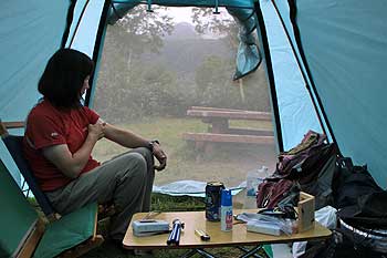 テントの中に逃げ込んだが、メッシュの窓を通しても雨が入ってくるので、出入り口を完全に閉めて、小さなテントの中で二人で呆然とするしかない。