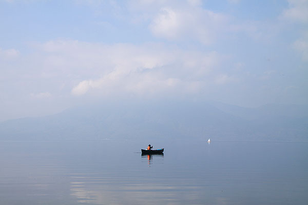 白く霞んだ湖にポツンと浮かぶカヌー。何とも幻想的な風景である。