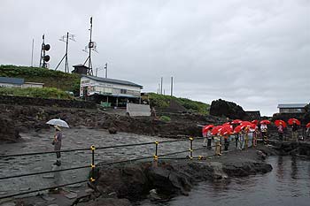 | 仙法志御崎公園で団体さんの赤い傘が目立っていた | やん衆の会話に聞き耳を立てるかみさん |