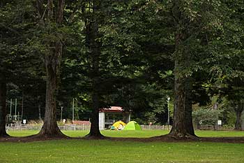 到着したキャンプ場は、広い場内に数張りのテントがあるだけで閑散としていた。