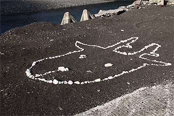 | 白い石で描かれた牛さん | 電動カートが渡っていく |