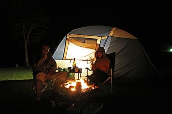 焚き火の前でワインを飲みながら、二人でマラソンの反省会。 |