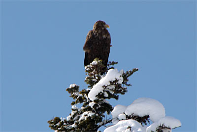オジロワシが飛んできて近くのマツの先端にとまった。