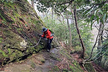 横に回り込むと垂直の岩場に鎖が垂らされていて、どうやらそこを登るらしい。
