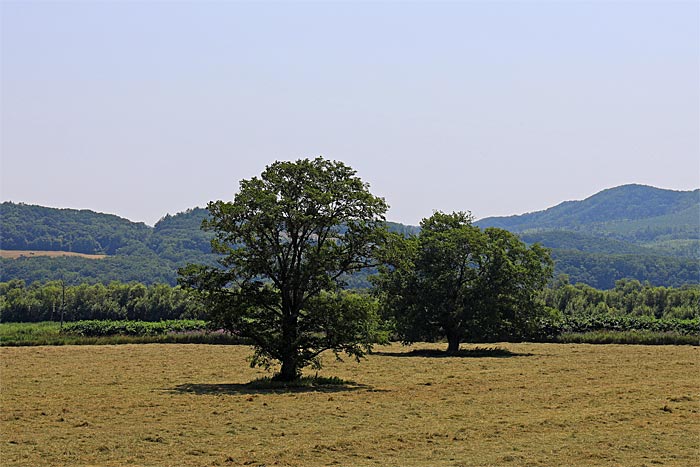 ハルニレの木が生えている河川敷の牧草畑は、丁度牧草が刈られたばかりで乾燥しているところだった。