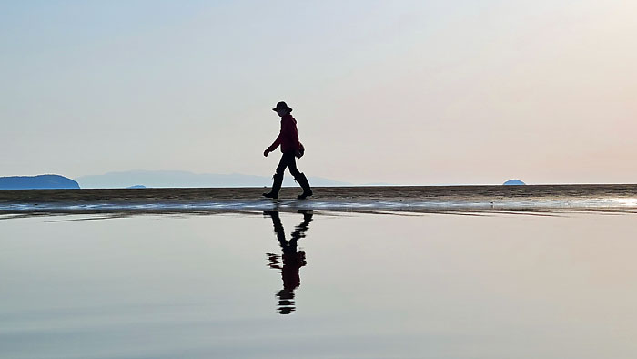 風は弱いけれど砂浜の中に残っている海面には微妙なさざ波が立っているようで、海面に映った姿がどうしても揺らいでしまう。