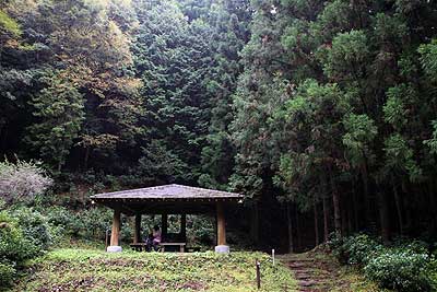 そして突然舗装道路へと出てきた。ここが三越峠で、休憩所でお弁当を食べることにする。