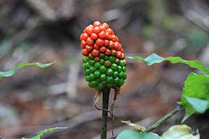 そのご夫婦が、赤い実を沢山付けた植物を見つけて「これは何でしょう?」と聞いてきたので、かみさんがすかさず「これはまむし草と言って、上の方から順番に実が赤く染まってくるのですよ」と説明していた。