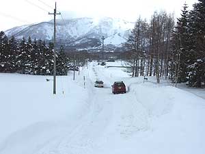 通常は半月湖の入り口にある駐車場まで車で入れますが、冬の間は道路はその手前までしか除雪されていません。 このように、路上駐車することになりますが、道路を塞いでしまわないように、気をつけて駐車しましょう。 |