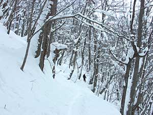 これが湖まで降りる道、斜面を斜めに降りる感じです。 先に歩いた人の跡が無ければ解りづらいかもしれませんが、人気のフィールドなので余程の大雪の後で無ければ、誰かが歩いた跡は残っていると思います。 それほど危険な場所では無いですが、足を踏み外すと痛い目には遭いそうです。 |