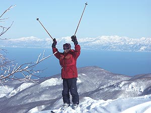 リフトを2本乗り継いで長峰の頂上までやってくると、また違う景色が広がっている。深雪をこいで切り立った斜面の端まで行ってみると、眼下に日本海が広がっていた。そして遠くには増毛の山並み、毛無し峠で見た風景よりもこちらの方がダイナミックである。