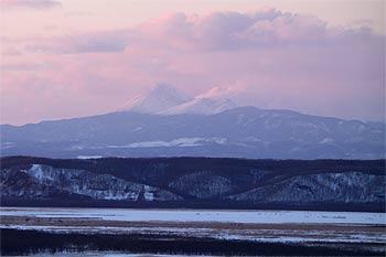 | 細岡展望台に現れたキタキツネ | 夕日を受けてピンクに染まる阿寒の山 |