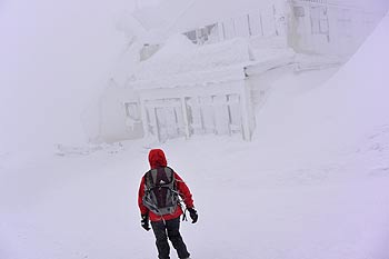 今年に入ってから今日までの、酸ヶ湯での日照時間合計は僅か9.9時間しかないのだ。 八甲田ではスノーシューのツアーを申し込んでおいたので、スキー客で賑わうロープウェー駅に着くと、早速ガイドの方が声をかけてきてくれた。 ロープウェーの中は、平日にもかかわらずスキー客で満員である。 山頂駅のこの日の天候。昨日からの降雪量60センチ、気温−16℃、風速22m。 それなりに冬山にも登っていて、装備も山登りの時とほぼ同じ。 |