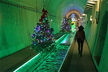 中央部を湧水が勢いよく流れているだけの何の変哲もないトンネルだけれど、クリスマスの飾り付けやイルミネーション、プロジェクションマッピング等もあって結構楽しめる。