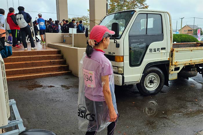 スタート時間まで雨宿り、こんな雨除けポンチョを着用