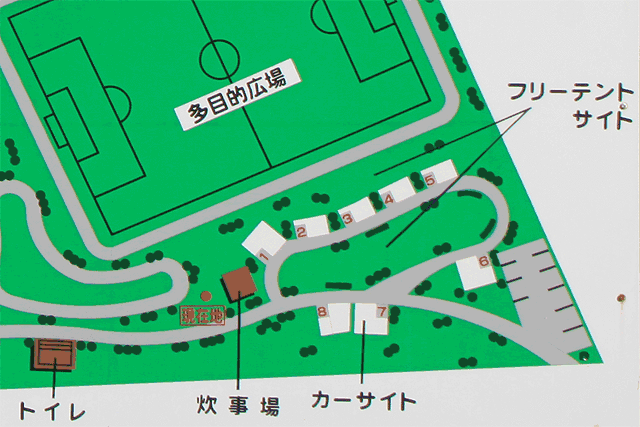 キャンプ場内をぐるりと一回りする通路の内側がフリーサイト、外側が駐車スペースのあるオートサイトになっている。