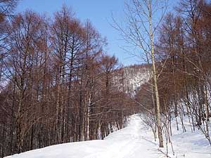 スノーモービルの耳障りな騒音が次第に近づいてきた。林道の上で追い越されて、排気ガスでも吸わされたら堪らんな〜と思っていたら、そのスノーモービルは林の中を真直ぐに登ってきたようで、私達の歩くかなり前の方にぴょんと飛び出してきて、そのまま林道を走っていってしまった。