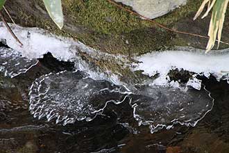 所々に開いている沢の水面を覗き込むと、そこにできた美しい氷の造形物が目を楽しませてくれる。