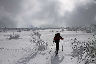 森林限界より上の広大なスロープ部分も、樹氷に吹きだまりにアイスバーンにと、障害物だらけでまともに滑ってはいられない。