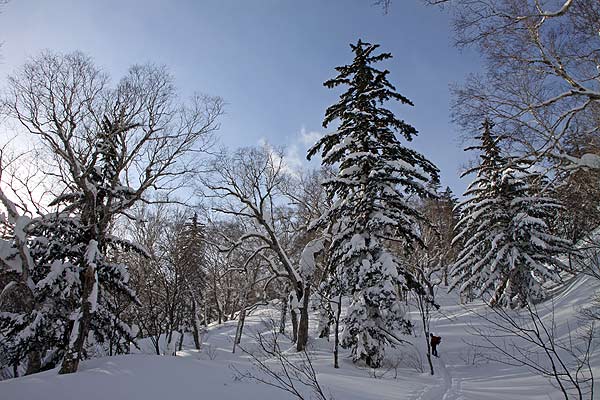 たっぷりと雪を乗せた枝をしな垂れるトドマツ。曲がりくねった枝を広げるダケカンバ。