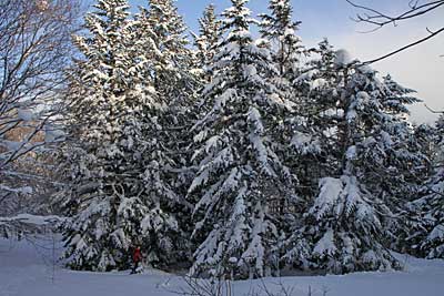 私たちにとっては登り慣れている場所でもあるので、自分たちの登りたいルートにあるトレースを順番に利用しながら、登っていく。 次第に青空が広がり、白い森の中にも陽が射してくる。そうすると、ただでさえ美しかった森の風景が、更に美しく見えてくる。青空は全く期待せずに登り始めたので、予想外の展開に心が弾む。 沢の源頭を横切る部分ではそれまでバラバラだったトレースがほぼ1本にまとまっていたので、私達もそのルートを歩く。ところが、そこを渡って最後に300m大地のアカエゾマツ林へ登るところがやたらに急で苦労させられる。今までこんなところで苦労したことは無く、変だなと思いながら周りを見渡すと、そこよりもっと上の部分に別のトレースが残っていた。他人のトレースが常に正しいものとは限らないのである。