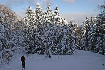 最初の林道の分岐で、ちょっと迷いそうになった。 静寂に包まれた森の中では、自分のスキーが雪を踏みしめる音しか聞こえない。 |