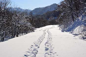 2年前に来た時は、川の対岸に沖里河温泉の潰れかけた建物が見えていたのに、そこは更地になってしまっていた。 雪を被った森の中を歩き、山の斜面を一気に登って尾根の上へと出る。
