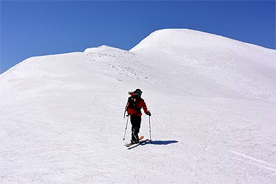 もう少しで山頂というところで、斜面の陰からスキーを履いた登山者が現れた。 折れかけた心をもう一度奮い立たせ、そこから一旦滑り下りて、本物の山頂を目指した。 11時50分、積丹岳山頂に到着。 先に登っていた男性も、「積丹岳に登ってこんなに晴れていたのは初めてです」と感動した面持ちである。 |