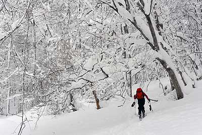 山頂から北東方向へ続く斜面は、小さな沢地形を間に挟んで大体3つの尾根に分かれている。 それを避けるために、滑っている途中で何度も止まっては、GPSで現在地を確認する。 途中で男女の二人連れに出会った。 |