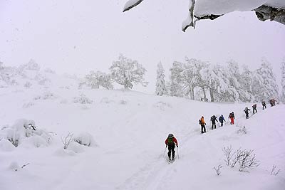 カヌークラブの新年会は、恒例の十勝岳連峰の三段山。 途中で降り続いていた雪は、ここに来て更に降り方が強まっていた。。 メンバーは11名。