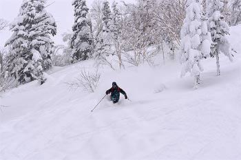 | 雪崩で死者が出たこともある2段目斜面 | 2段目斜面を滑り降りる |