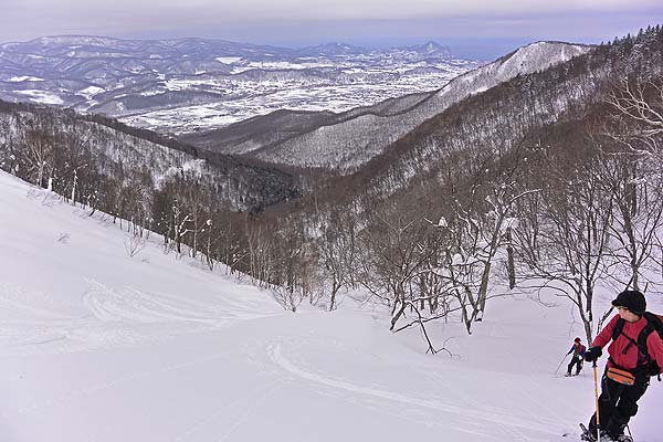 | 気持ち良く滑れそうな沢だ | 背後に仁木町の街並みが見える |