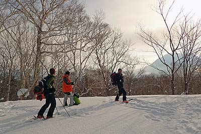 登りのトレースはそれ程急でもないのに、何度もスリップしてしまう。 前を登るI山さん、T山さん、かみさんの3人から次第に遅れ始める。 右手眼下には京極町の街並みが見下ろせる。 |